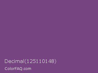 Decimal 125110148 Color is a normal purple color and the nearest color is Maximum Purple #733380. Hex code #764480 and RGB value is rgb(118,68,128). In RGB color space, this color is composed of 46% red, 27% green, 50% blue, In CMYK color space, this color is composed of 8% cyan, 47% magenta, 0% yellow , 50% black , In HSL color space, this color has a hue angle of 290° , 31% saturation and 38% lightness.