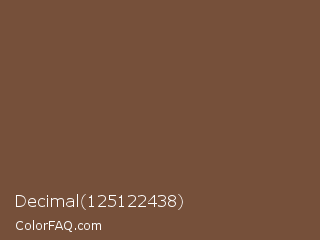 Decimal 125122438 Color is a normal orange color and the nearest color is Tuscan Brown Coffee #6f4e37. Hex code #76503a and RGB value is rgb(118,80,58). In RGB color space, this color is composed of 46% red, 31% green, 23% blue, In CMYK color space, this color is composed of 0% cyan, 32% magenta, 51% yellow , 54% black , In HSL color space, this color has a hue angle of 22° , 34% saturation and 35% lightness.