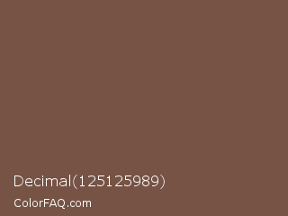 Decimal 125125989 Color is a normal orange color and the nearest color is Tobacco Brown #715d47. Hex code #765345 and RGB value is rgb(118,83,69). In RGB color space, this color is composed of 46% red, 33% green, 27% blue, In CMYK color space, this color is composed of 0% cyan, 30% magenta, 42% yellow , 54% black , In HSL color space, this color has a hue angle of 17° , 26% saturation and 37% lightness.
