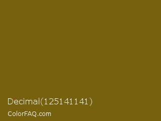 Decimal 125141141 Color is a dark yellow color and the nearest color is Spicy Mustard #74640d. Hex code #76610f and RGB value is rgb(118,97,15). In RGB color space, this color is composed of 46% red, 38% green, 6% blue, In CMYK color space, this color is composed of 0% cyan, 18% magenta, 87% yellow , 54% black , In HSL color space, this color has a hue angle of 48° , 77% saturation and 26% lightness.