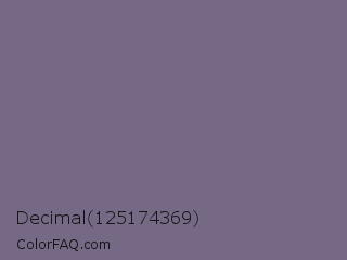 Decimal 125174369 Color is a normal violet color and the nearest color is Rum #796989. Hex code #766985 and RGB value is rgb(118,105,133). In RGB color space, this color is composed of 46% red, 41% green, 52% blue, In CMYK color space, this color is composed of 11% cyan, 21% magenta, 0% yellow , 48% black , In HSL color space, this color has a hue angle of 268° , 12% saturation and 47% lightness.