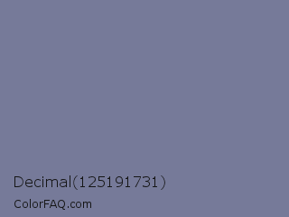 Decimal 125191731 Color is a normal blue color and the nearest color is Rhythm #777696. Hex code #767a99 and RGB value is rgb(118,122,153). In RGB color space, this color is composed of 46% red, 48% green, 60% blue, In CMYK color space, this color is composed of 23% cyan, 20% magenta, 0% yellow , 40% black , In HSL color space, this color has a hue angle of 233° , 15% saturation and 53% lightness.