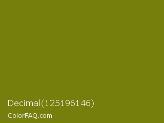 Decimal 125196146 Color is a dark yellow color and the nearest color is Olive #808000. Hex code #767f0c and RGB value is rgb(118,127,12). In RGB color space, this color is composed of 46% red, 50% green, 5% blue, In CMYK color space, this color is composed of 7% cyan, 0% magenta, 91% yellow , 50% black , In HSL color space, this color has a hue angle of 65° , 83% saturation and 27% lightness.