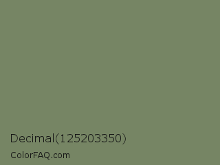 Decimal 125203350 Color is a normal green color and the nearest color is Flax Smoke #7b8265. Hex code #768564 and RGB value is rgb(118,133,100). In RGB color space, this color is composed of 46% red, 52% green, 39% blue, In CMYK color space, this color is composed of 11% cyan, 0% magenta, 25% yellow , 48% black , In HSL color space, this color has a hue angle of 87° , 14% saturation and 46% lightness.