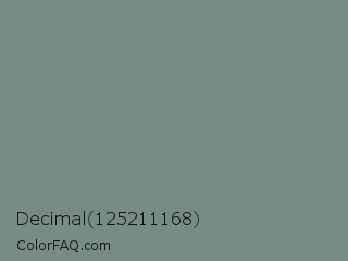 Decimal 125211168 Color is a normal green color and the nearest color is Blue Smoke #748881. Hex code #768c84 and RGB value is rgb(118,140,132). In RGB color space, this color is composed of 46% red, 55% green, 52% blue, In CMYK color space, this color is composed of 16% cyan, 0% magenta, 6% yellow , 45% black , In HSL color space, this color has a hue angle of 158° , 9% saturation and 51% lightness.