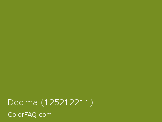 Decimal 125212211 Color is a normal lime color and the nearest color is Wasabi #788a25. Hex code #768e21 and RGB value is rgb(118,142,33). In RGB color space, this color is composed of 46% red, 56% green, 13% blue, In CMYK color space, this color is composed of 17% cyan, 0% magenta, 77% yellow , 44% black , In HSL color space, this color has a hue angle of 73° , 62% saturation and 34% lightness.