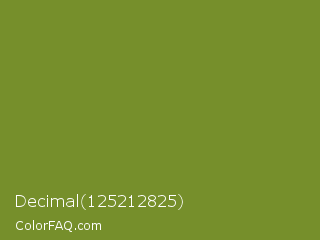 Decimal 125212825 Color is a normal lime color and the nearest color is Wasabi #788a25. Hex code #768f2b and RGB value is rgb(118,143,43). In RGB color space, this color is composed of 46% red, 56% green, 17% blue, In CMYK color space, this color is composed of 17% cyan, 0% magenta, 70% yellow , 44% black , In HSL color space, this color has a hue angle of 75° , 54% saturation and 36% lightness.