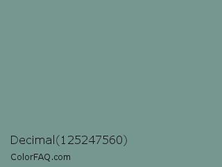 Decimal 125247560 Color is a normal cyan color and the nearest color is Juniper #6d9292. Hex code #769790 and RGB value is rgb(118,151,144). In RGB color space, this color is composed of 46% red, 59% green, 56% blue, In CMYK color space, this color is composed of 22% cyan, 0% magenta, 5% yellow , 41% black , In HSL color space, this color has a hue angle of 167° , 14% saturation and 53% lightness.