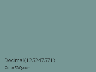 Decimal 125247571 Color is a normal cyan color and the nearest color is Juniper #6d9292. Hex code #769795 and RGB value is rgb(118,151,149). In RGB color space, this color is composed of 46% red, 59% green, 58% blue, In CMYK color space, this color is composed of 22% cyan, 0% magenta, 1% yellow , 41% black , In HSL color space, this color has a hue angle of 176° , 14% saturation and 53% lightness.