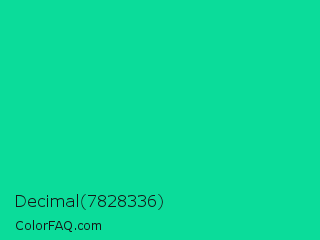Decimal 7828336 Color is a normal green color and the nearest color is Caribbean Green #00cc99. Hex code #0bdc9a and RGB value is rgb(11,220,154). In RGB color space, this color is composed of 4% red, 86% green, 60% blue, In CMYK color space, this color is composed of 95% cyan, 0% magenta, 30% yellow , 14% black , In HSL color space, this color has a hue angle of 161° , 90% saturation and 45% lightness.