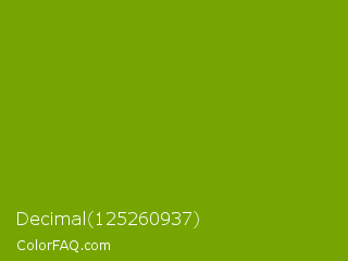 Decimal 125260937 Color is a normal lime color and the nearest color is Limeade #6f9d02. Hex code #76a501 and RGB value is rgb(118,165,1). In RGB color space, this color is composed of 46% red, 65% green, 0% blue, In CMYK color space, this color is composed of 28% cyan, 0% magenta, 99% yellow , 35% black , In HSL color space, this color has a hue angle of 77° , 99% saturation and 33% lightness.