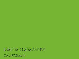 Decimal 125277749 Color is a normal green color and the nearest color is Green RYB #66b032. Hex code #76b533 and RGB value is rgb(118,181,51). In RGB color space, this color is composed of 46% red, 71% green, 20% blue, In CMYK color space, this color is composed of 35% cyan, 0% magenta, 72% yellow , 29% black , In HSL color space, this color has a hue angle of 89° , 56% saturation and 45% lightness.