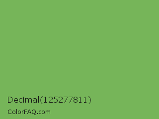 Decimal 125277811 Color is a normal green color and the nearest color is Bud Green #7bb661. Hex code #76b559 and RGB value is rgb(118,181,89). In RGB color space, this color is composed of 46% red, 71% green, 35% blue, In CMYK color space, this color is composed of 35% cyan, 0% magenta, 51% yellow , 29% black , In HSL color space, this color has a hue angle of 101° , 38% saturation and 53% lightness.