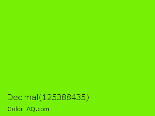 Decimal 125388435 Color is a normal green color and the nearest color is Lawn Green #7cfc00. Hex code #76f005 and RGB value is rgb(118,240,5). In RGB color space, this color is composed of 46% red, 94% green, 2% blue, In CMYK color space, this color is composed of 51% cyan, 0% magenta, 98% yellow , 6% black , In HSL color space, this color has a hue angle of 91° , 96% saturation and 48% lightness.