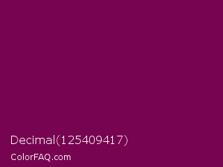 Decimal 125409417 Color is a dark magenta color and the nearest color is Rose Bud Cherry #800b47. Hex code #770451 and RGB value is rgb(119,4,81). In RGB color space, this color is composed of 47% red, 2% green, 32% blue, In CMYK color space, this color is composed of 0% cyan, 97% magenta, 32% yellow , 53% black , In HSL color space, this color has a hue angle of 320° , 93% saturation and 24% lightness.