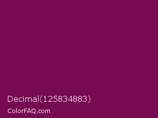 Decimal 125834883 Color is a dark magenta color and the nearest color is French Plum #811453. Hex code #770b53 and RGB value is rgb(119,11,83). In RGB color space, this color is composed of 47% red, 4% green, 33% blue, In CMYK color space, this color is composed of 0% cyan, 91% magenta, 30% yellow , 53% black , In HSL color space, this color has a hue angle of 320° , 83% saturation and 25% lightness.