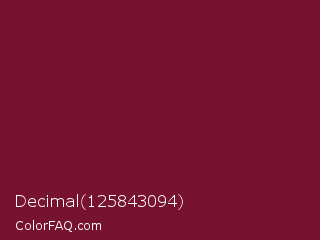 Decimal 125843094 Color is a dark rose color and the nearest color is Claret #7f1734. Hex code #771330 and RGB value is rgb(119,19,48). In RGB color space, this color is composed of 47% red, 7% green, 19% blue, In CMYK color space, this color is composed of 0% cyan, 84% magenta, 60% yellow , 53% black , In HSL color space, this color has a hue angle of 343° , 72% saturation and 27% lightness.