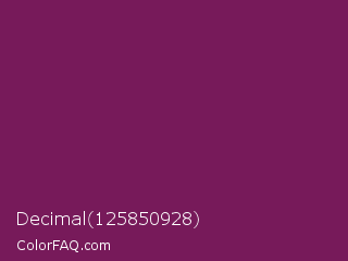 Decimal 125850928 Color is a dark magenta color and the nearest color is French Plum #811453. Hex code #771a5a and RGB value is rgb(119,26,90). In RGB color space, this color is composed of 47% red, 10% green, 35% blue, In CMYK color space, this color is composed of 0% cyan, 78% magenta, 24% yellow , 53% black , In HSL color space, this color has a hue angle of 319° , 64% saturation and 28% lightness.
