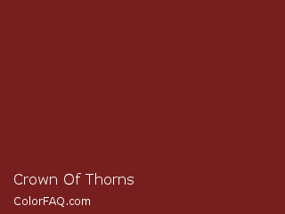 Decimal 125855569 Color is a dark red color, the color name is Crown Of Thorns and the nearest color is Persian Plum #701c1c. Hex code #771f1f and RGB value is rgb(119,31,31). In RGB color space, this color is composed of 47% red, 12% green, 12% blue, In CMYK color space, this color is composed of 0% cyan, 74% magenta, 74% yellow , 53% black , In HSL color space, this color has a hue angle of 0° , 59% saturation and 29% lightness.