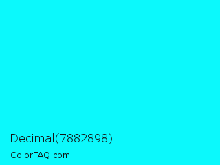 Decimal 7882898 Color is a normal cyan color and the nearest color is Loeen #15f2fd. Hex code #0bf9fc and RGB value is rgb(11,249,252). In RGB color space, this color is composed of 4% red, 98% green, 99% blue, In CMYK color space, this color is composed of 96% cyan, 1% magenta, 0% yellow , 1% black , In HSL color space, this color has a hue angle of 181° , 98% saturation and 52% lightness.