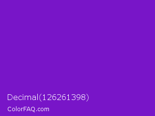 Decimal 126261398 Color is a normal purple color and the nearest color is French Violet #8806ce. Hex code #7815c8 and RGB value is rgb(120,21,200). In RGB color space, this color is composed of 47% red, 8% green, 78% blue, In CMYK color space, this color is composed of 40% cyan, 90% magenta, 0% yellow , 22% black , In HSL color space, this color has a hue angle of 273° , 81% saturation and 43% lightness.
