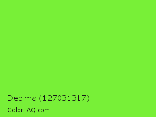 Decimal 127031317 Color is a normal green color and the nearest color is Spring Frost #87ff2a. Hex code #78f037 and RGB value is rgb(120,240,55). In RGB color space, this color is composed of 47% red, 94% green, 22% blue, In CMYK color space, this color is composed of 50% cyan, 0% magenta, 77% yellow , 6% black , In HSL color space, this color has a hue angle of 99° , 86% saturation and 58% lightness.