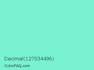 Decimal 127034496 Color is a light green color and the nearest color is Aquamarine #7fffd4. Hex code #78f2d0 and RGB value is rgb(120,242,208). In RGB color space, this color is composed of 47% red, 95% green, 82% blue, In CMYK color space, this color is composed of 50% cyan, 0% magenta, 14% yellow , 5% black , In HSL color space, this color has a hue angle of 163° , 82% saturation and 71% lightness.