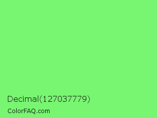 Decimal 127037779 Color is a light green color and the nearest color is Screamin Green #66ff66. Hex code #78f571 and RGB value is rgb(120,245,113). In RGB color space, this color is composed of 47% red, 96% green, 44% blue, In CMYK color space, this color is composed of 51% cyan, 0% magenta, 54% yellow , 4% black , In HSL color space, this color has a hue angle of 117° , 87% saturation and 70% lightness.