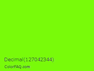 Decimal 127042344 Color is a normal green color and the nearest color is Lawn Green #7cfc00. Hex code #78fa08 and RGB value is rgb(120,250,8). In RGB color space, this color is composed of 47% red, 98% green, 3% blue, In CMYK color space, this color is composed of 52% cyan, 0% magenta, 97% yellow , 2% black , In HSL color space, this color has a hue angle of 92° , 96% saturation and 51% lightness.