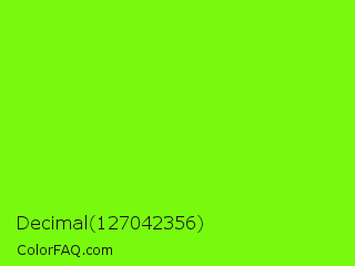 Decimal 127042356 Color is a normal green color and the nearest color is Lawn Green #7cfc00. Hex code #78fa0e and RGB value is rgb(120,250,14). In RGB color space, this color is composed of 47% red, 98% green, 5% blue, In CMYK color space, this color is composed of 52% cyan, 0% magenta, 94% yellow , 2% black , In HSL color space, this color has a hue angle of 93° , 96% saturation and 52% lightness.