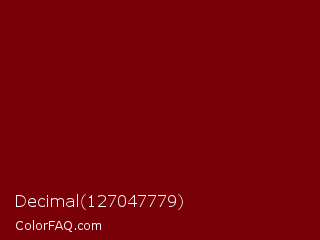 Decimal 127047779 Color is a dark red color and the nearest color is Japanese Maple #780109. Hex code #790007 and RGB value is rgb(121,0,7). In RGB color space, this color is composed of 47% red, 0% green, 3% blue, In CMYK color space, this color is composed of 0% cyan, 100% magenta, 94% yellow , 53% black , In HSL color space, this color has a hue angle of 357° , 100% saturation and 24% lightness.