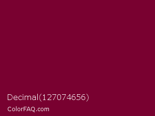 Decimal 127074656 Color is a dark rose color and the nearest color is Siren #7a013a. Hex code #790130 and RGB value is rgb(121,1,48). In RGB color space, this color is composed of 47% red, 0% green, 19% blue, In CMYK color space, this color is composed of 0% cyan, 99% magenta, 60% yellow , 53% black , In HSL color space, this color has a hue angle of 337° , 98% saturation and 24% lightness.