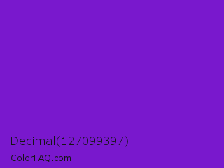 Decimal 127099397 Color is a normal purple color and the nearest color is French Violet #8806ce. Hex code #7918cd and RGB value is rgb(121,24,205). In RGB color space, this color is composed of 47% red, 9% green, 80% blue, In CMYK color space, this color is composed of 41% cyan, 88% magenta, 0% yellow , 20% black , In HSL color space, this color has a hue angle of 272° , 79% saturation and 45% lightness.