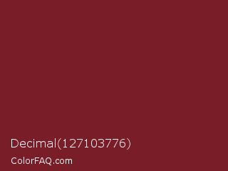Decimal 127103776 Color is a dark red color and the nearest color is Crown Of Thorns #771f1f. Hex code #791d28 and RGB value is rgb(121,29,40). In RGB color space, this color is composed of 47% red, 11% green, 16% blue, In CMYK color space, this color is composed of 0% cyan, 76% magenta, 67% yellow , 53% black , In HSL color space, this color has a hue angle of 353° , 61% saturation and 29% lightness.