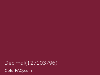 Decimal 127103796 Color is a dark rose color and the nearest color is Claret #7f1734. Hex code #791d36 and RGB value is rgb(121,29,54). In RGB color space, this color is composed of 47% red, 11% green, 21% blue, In CMYK color space, this color is composed of 0% cyan, 76% magenta, 55% yellow , 53% black , In HSL color space, this color has a hue angle of 344° , 61% saturation and 29% lightness.