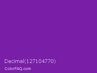 Decimal 127104770 Color is a normal purple color and the nearest color is Grape #6f2da8. Hex code #791ea6 and RGB value is rgb(121,30,166). In RGB color space, this color is composed of 47% red, 12% green, 65% blue, In CMYK color space, this color is composed of 27% cyan, 82% magenta, 0% yellow , 35% black , In HSL color space, this color has a hue angle of 280° , 69% saturation and 38% lightness.