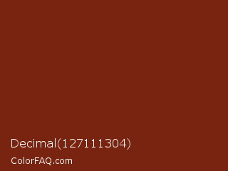 Decimal 127111304 Color is a dark red color and the nearest color is Pueblo #7d2c14. Hex code #792410 and RGB value is rgb(121,36,16). In RGB color space, this color is composed of 47% red, 14% green, 6% blue, In CMYK color space, this color is composed of 0% cyan, 70% magenta, 87% yellow , 53% black , In HSL color space, this color has a hue angle of 11° , 77% saturation and 27% lightness.