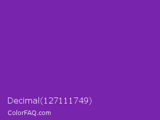 Decimal 127111749 Color is a normal purple color and the nearest color is Grape #6f2da8. Hex code #7924ad and RGB value is rgb(121,36,173). In RGB color space, this color is composed of 47% red, 14% green, 68% blue, In CMYK color space, this color is composed of 30% cyan, 79% magenta, 0% yellow , 32% black , In HSL color space, this color has a hue angle of 277° , 66% saturation and 41% lightness.