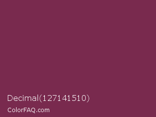 Decimal 127141510 Color is a normal rose color and the nearest color is Dark Raspberry #872657. Hex code #792a4e and RGB value is rgb(121,42,78). In RGB color space, this color is composed of 47% red, 16% green, 31% blue, In CMYK color space, this color is composed of 0% cyan, 65% magenta, 36% yellow , 53% black , In HSL color space, this color has a hue angle of 333° , 48% saturation and 32% lightness.