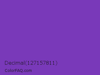 Decimal 127157811 Color is a normal violet color and the nearest color is Studio #714ab2. Hex code #7939b9 and RGB value is rgb(121,57,185). In RGB color space, this color is composed of 47% red, 22% green, 73% blue, In CMYK color space, this color is composed of 35% cyan, 69% magenta, 0% yellow , 27% black , In HSL color space, this color has a hue angle of 270° , 53% saturation and 47% lightness.