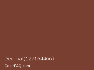 Decimal 127164466 Color is a normal red color and the nearest color is Nutmeg #81422c. Hex code #793f30 and RGB value is rgb(121,63,48). In RGB color space, this color is composed of 47% red, 25% green, 19% blue, In CMYK color space, this color is composed of 0% cyan, 48% magenta, 60% yellow , 53% black , In HSL color space, this color has a hue angle of 12° , 43% saturation and 33% lightness.