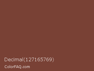 Decimal 127165769 Color is a normal red color and the nearest color is Medium Tuscan Red #79443b. Hex code #794135 and RGB value is rgb(121,65,53). In RGB color space, this color is composed of 47% red, 25% green, 21% blue, In CMYK color space, this color is composed of 0% cyan, 46% magenta, 56% yellow , 53% black , In HSL color space, this color has a hue angle of 11° , 39% saturation and 34% lightness.
