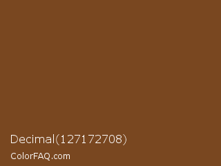 Decimal 127172708 Color is a dark orange color and the nearest color is Russet #80461b. Hex code #794720 and RGB value is rgb(121,71,32). In RGB color space, this color is composed of 47% red, 28% green, 13% blue, In CMYK color space, this color is composed of 0% cyan, 41% magenta, 74% yellow , 53% black , In HSL color space, this color has a hue angle of 26° , 58% saturation and 30% lightness.