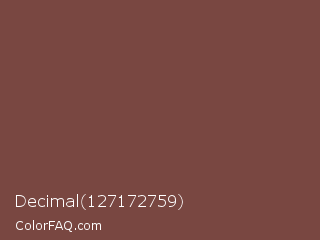 Decimal 127172759 Color is a normal red color and the nearest color is Medium Tuscan Red #79443b. Hex code #794741 and RGB value is rgb(121,71,65). In RGB color space, this color is composed of 47% red, 28% green, 25% blue, In CMYK color space, this color is composed of 0% cyan, 41% magenta, 46% yellow , 53% black , In HSL color space, this color has a hue angle of 6° , 30% saturation and 36% lightness.
