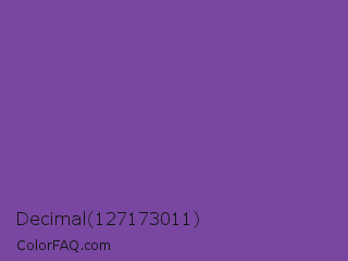 Decimal 127173011 Color is a normal purple color and the nearest color is Royal Purple #7851a9. Hex code #7947a1 and RGB value is rgb(121,71,161). In RGB color space, this color is composed of 47% red, 28% green, 63% blue, In CMYK color space, this color is composed of 25% cyan, 56% magenta, 0% yellow , 37% black , In HSL color space, this color has a hue angle of 273° , 39% saturation and 45% lightness.