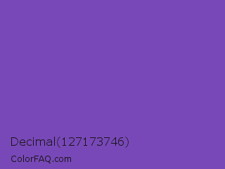 Decimal 127173746 Color is a normal violet color and the nearest color is Studio #714ab2. Hex code #7948b8 and RGB value is rgb(121,72,184). In RGB color space, this color is composed of 47% red, 28% green, 72% blue, In CMYK color space, this color is composed of 34% cyan, 61% magenta, 0% yellow , 28% black , In HSL color space, this color has a hue angle of 266° , 44% saturation and 50% lightness.