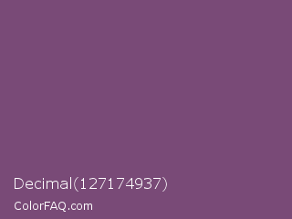 Decimal 127174937 Color is a normal magenta color and the nearest color is Twilight Lavender #8a496b. Hex code #794a77 and RGB value is rgb(121,74,119). In RGB color space, this color is composed of 47% red, 29% green, 47% blue, In CMYK color space, this color is composed of 0% cyan, 39% magenta, 2% yellow , 53% black , In HSL color space, this color has a hue angle of 303° , 24% saturation and 38% lightness.
