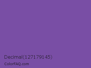 Decimal 127179145 Color is a normal violet color and the nearest color is Royal Purple #7851a9. Hex code #794ea5 and RGB value is rgb(121,78,165). In RGB color space, this color is composed of 47% red, 31% green, 65% blue, In CMYK color space, this color is composed of 27% cyan, 53% magenta, 0% yellow , 35% black , In HSL color space, this color has a hue angle of 270° , 36% saturation and 48% lightness.