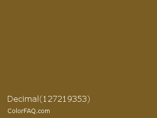 Decimal 127219353 Color is a normal orange color and the nearest color is Kumera #886221. Hex code #795d23 and RGB value is rgb(121,93,35). In RGB color space, this color is composed of 47% red, 36% green, 14% blue, In CMYK color space, this color is composed of 0% cyan, 23% magenta, 71% yellow , 53% black , In HSL color space, this color has a hue angle of 40° , 55% saturation and 31% lightness.