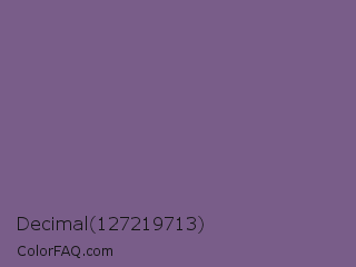 Decimal 127219713 Color is a normal purple color and the nearest color is Rum #796989. Hex code #795d89 and RGB value is rgb(121,93,137). In RGB color space, this color is composed of 47% red, 36% green, 54% blue, In CMYK color space, this color is composed of 12% cyan, 32% magenta, 0% yellow , 46% black , In HSL color space, this color has a hue angle of 278° , 19% saturation and 45% lightness.